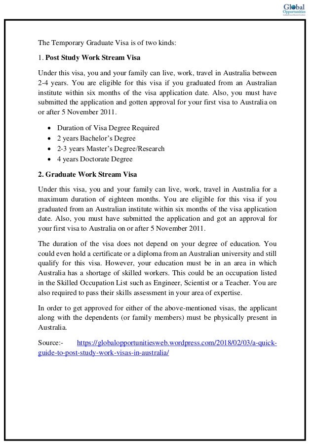 A Quick Guide To Post Study Work Visas In Australia The graduate visa (485) allows recent university graduates and certain vocational graduates the chance to remain in australia and work after their studies have anytime throughout the temporary graduate visa, visa holders can apply for another permanent visa.